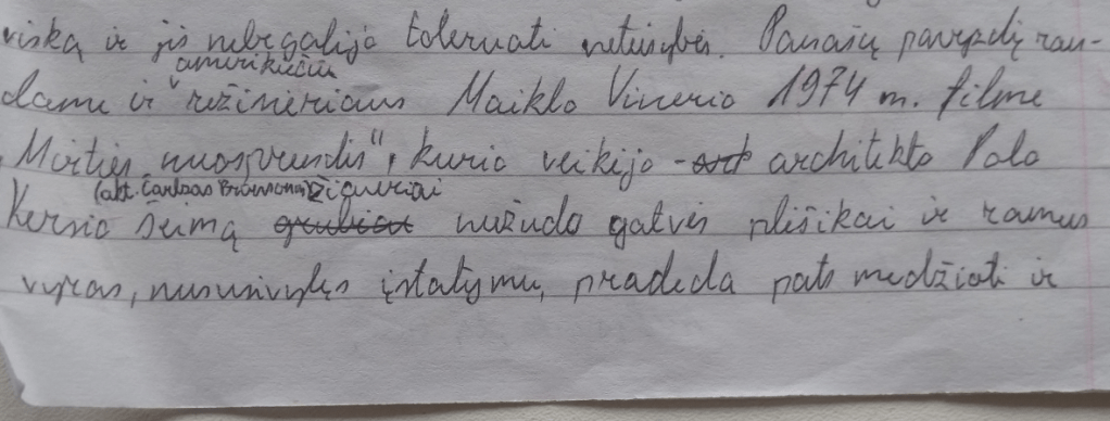Kitas tikrus šiurpuliukus iššaukęs nutikimas įvyko užvakar. Tądien su žmona leidome laiką mano mamos namuose – mamai atostogaujant prižiūrėjome meilės ir maisto visad ištroškusias mylimas kates. Po sėkmingų dienos darbų nusprendžiau pažiūrėti seniai matytą filmą „Death Wish“ (1974 m.), supažindinti žmoną su dar vienu savo mėgstamu kino perliuku. Filmas susižiūrėjo labai smagiai. Kadangi kitą dieną turėjome aplankyti žmonos bobutę ir paminėti jos vardadienį ir kadangi smetonmečiu gimusioms bobutėms įvairiomis progomis (kažkodėl) dovanojami TIK pinigai, žmonai prireikė vokelio. Šio ieškodamas atsidariau mamos darbinio stalo stalčių ir nardydamas tarp sąskaitų ir kitų dokumentų aptikau popiergalį su savo paties rašysena. Iš stalčiaus ištraukiau mokyklinio sąsiuvinio lapą su savo dvyliktos klasės (2009 metų) samprotavimo rašiniu – pažvelgęs į jį sustingau, kūną išmušė karštis. Visiškai užmiršto ir nuo parašymo dienos veikiausiai neberegėto rašinio pirmajame puslapyje vieną iš savo teiginių grindžiau specifiškai referuodamas į tą patį – ką tik pažiūrėtą – „Death Wish“(!!!).