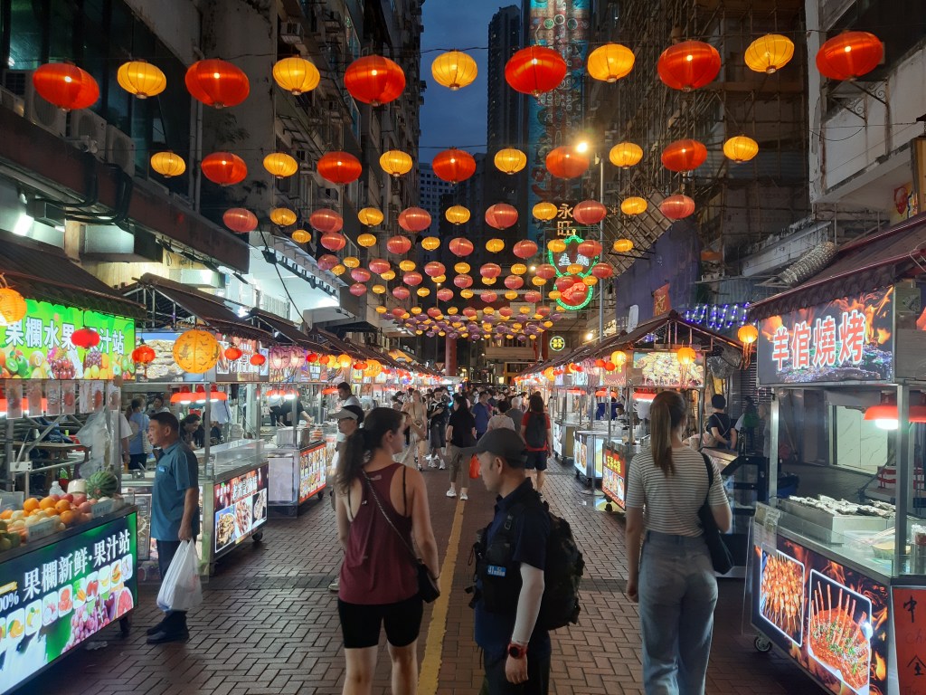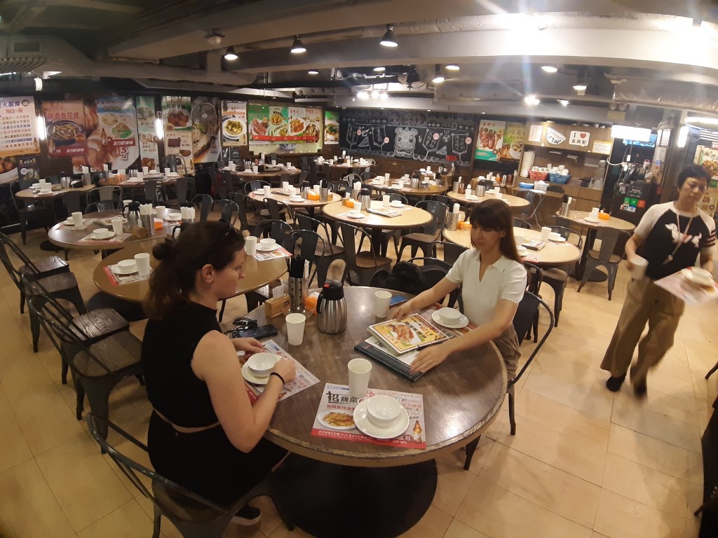 Visai šalia kertinės turistinės „arterijos“ susiradome internetinių rekomendacijų pasiūlytą tikrą vietinį restoranėlį išragauti vietos gėrybių. Lankytojų mažai, europiečiai/vakariečiai – tik mes su Jorūne ir Gabija. Blausios šviesos, daug spalvotų plakatų, kažkuo priminė valgyklą. Užeigėlės bosas – paliegęs, į laikraštį įnikęs diedulis, aptarnaujantis personalas – senojo dėdės vaikomos moterėlės: visi tarpusavy klegėjo magiškąja kantoniečių kalba. Buvome įsitikinę, kad po pusantro šimtmečio „po anglu“ honkongėnai puikiai šnekės angliškai. Deja NE (pridursiu, kad šiuo aspektu netikėtai sužibėjo Taivanas – ten angliškai mums teisingą kelią nurodė net stoties rajono bėdžius). Paprašius extra ryžių, padavėja sutriko. Pamanytum, kad bent žodelį „rice“ visi jie turėtų suprasti, bet moteriai prireikė bendradarbių (ar net elektroninių pričpindalų) pagalbos. Vėliau, kai vėl kažko užsimanėme, miriau iš laimės sulaukęs progos „įdarbinti“ šimtų honkongiečių fylmų peržiūromis įgytą patirtį: padavėjoms vis neprieinant prie mūsų, atsisukau į jų pusę ir mojuodamas ištiesta plaštaka aukštyn-žemyn it vėduokle užbaubiau: „WAI-WAI-WAI“ (vertimas: ALIOOO!). Dziedas iškart pakėlė akis ir <mygom> pasiuntė padavėją link mūsų. Gal kiek gruboka, bet bent HK fylmai byloja, kad toks tiesmukumas – paprastų jų miestiečių kultūros bazė.